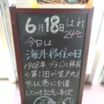 2021年6月18日 / 最終更新日 : 2021年6月18日 news 今日の黒板 海外移住の日 「日本から海外各地へ移住した人々の歴史や、国際社会への貢献などを振り返り、日本と移住先国との友好関係を促進する日」 国際協力機構(JICA)は2002年に移住船出港地の一つであった神奈川県横浜 […]